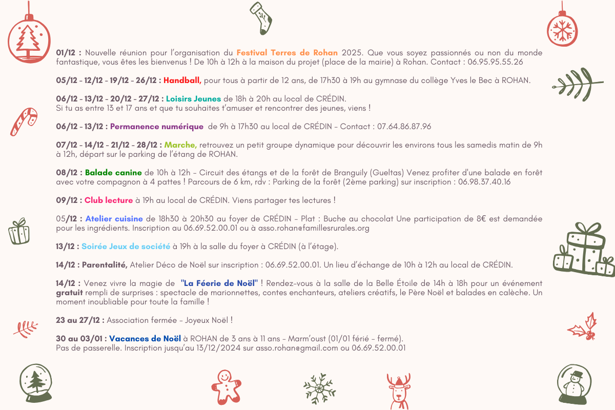 Le programme de décembre 2024 Publié par l'association ROHAN le 6 décembre 2024 Partager En Décembre, Familles rurales vous propose... Actualités Morbihan : atelier création en mosaïque adultes / jeunes le 29 janvier à Rohan Lire + Partager Bretagne : séjours été pour enfants et jeunes de l'association de Rohan. les inscriptions sont ouvertes ! Lire + Partager