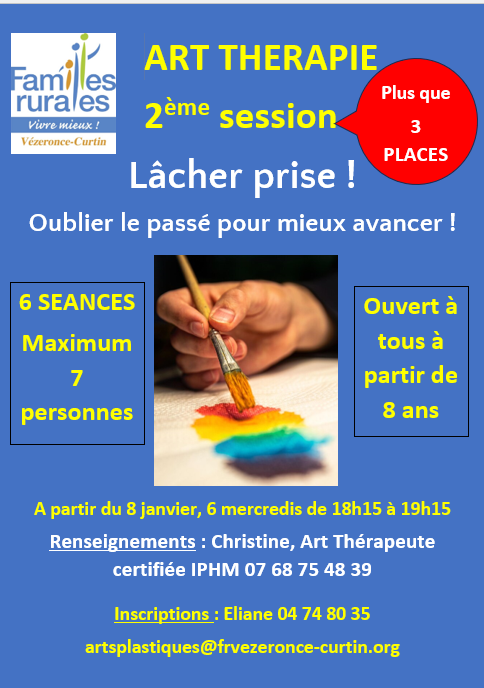 Familles Rurales lance la 2ème session d'Art Thérapie animée par Christine Coehlo à partir du 8 janvier 2025 :