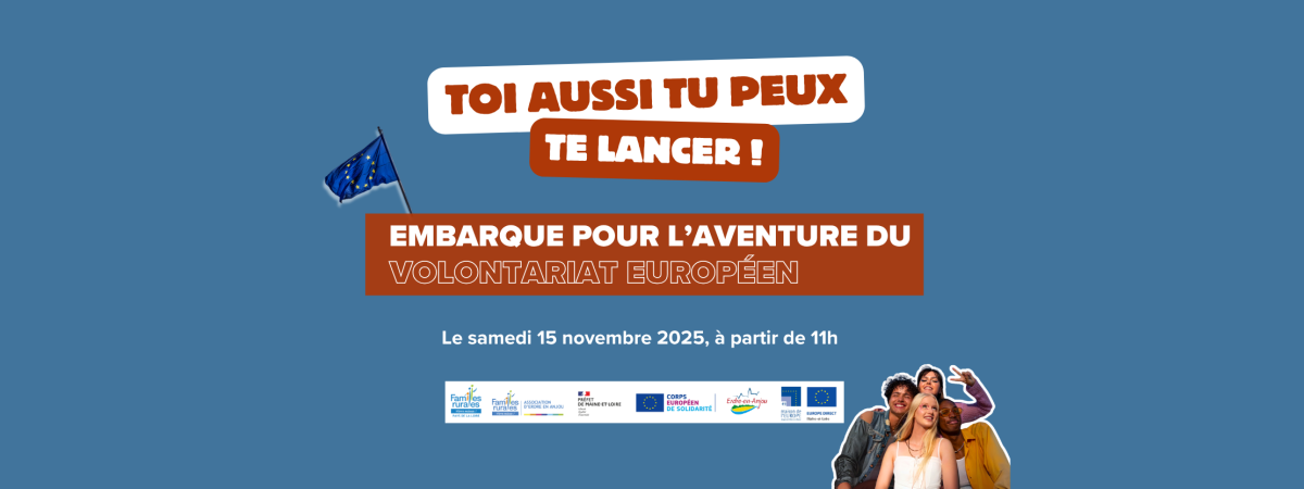 Le samedi 15 novembre prochain, la Fédération Régionale, en association avec l’Association Familles Rurales d’Erdre-en-Anjou, la Maison de l’Europe d’Angers et la Commune d'Erdre-en-Anjou, organisera un événement de présentation du volontariat européen. L’objectif est de se rapprocher des jeunes des milieux ruraux pour leur faire découvrir le dispositif, leur donner un accès égal à l’information et les encourager, par la suite, à s’engager dans une mission de volontariat européen.