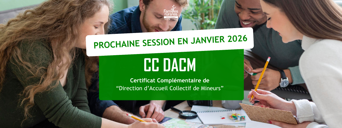La Fédération Régionale Familles Rurales des Pays de la Loire ouvre une nouvelle session de formation du Certificat Complémentaire de Direction d'ACM (CC DACM) en janvier 2026. Une belle opportunité pour les professionnels de l'animation souhaitant évoluer vers des postes de direction.