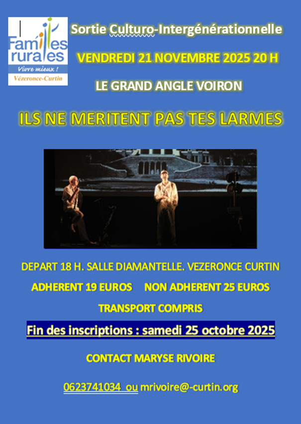 Prochainement sortie Culturo-intergénérationnelle le 21 novembre 2025 avec une pièce de théâtre à la salle Grand angle à Voiron "Ils ne méritent pas tes larmes"