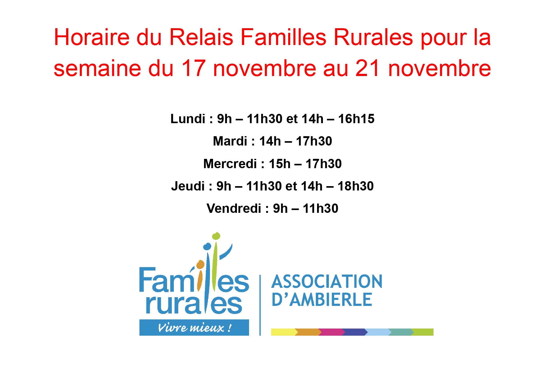 Horaires du Relais Familles Rurales pour la semaine du 17 au 21 Publié par l'association AMBIERLE le 17 novembre 2025 Partager Actualités Participez à notre concours de dessins de Noël et gagnez plein de cadeaux ! Lire + Partager Semaine de la prévention à Epagny : Familles Rurales y sera ! Lire + Partager AFR de Pringy : au beau fixe Lire + Partager