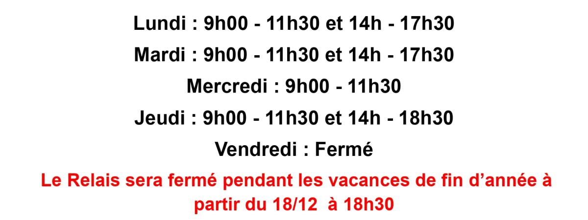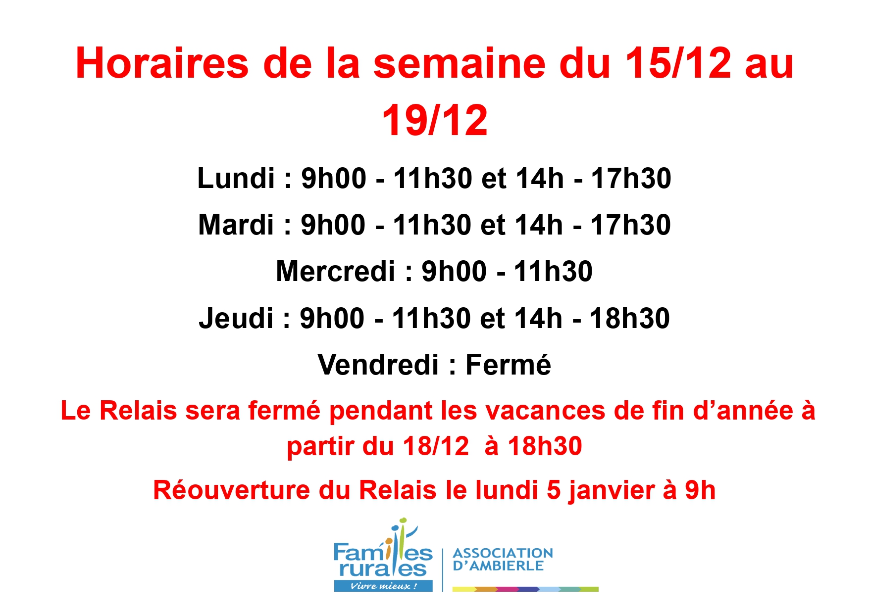 Horaire du Relais pour la semaine du 15 au 19 décembre Publié par l'association AMBIERLE le 16 décembre 2025 Partager Actualités 80 ans de l'Udaf 74 : Noël avant l'heure ! Lire + Partager Sévrier : bienvenue au Judo Club Semnoz ! Lire + Partager Chavanod : le changement dans la continuité Lire + Partager