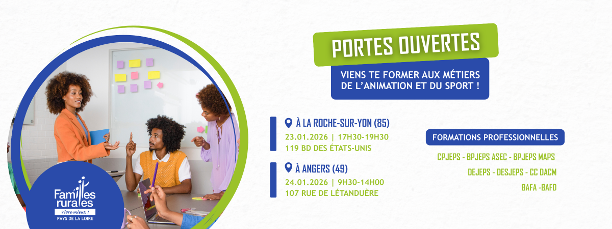 Nos prochaines portes ouvertes auront lieu les 23 et 24 janvier prochain. L'occasion de venir nous rencontrer et en savoir plus sur les différentes formations proposées au sein de la Fédération Régionale Familles Rurales des Pays de la Loire.
