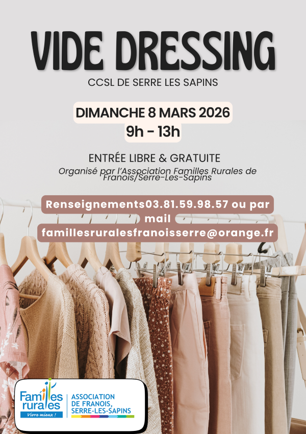 Vide dressing de Familles Rurales de Franois/Serre Voici la première édition du Vide Dressing!!! Depuis plusieurs années nous en rêvions!! Nous l'avons fait!!!! Nous vous attendons nombreux exposants et visiteurs!!