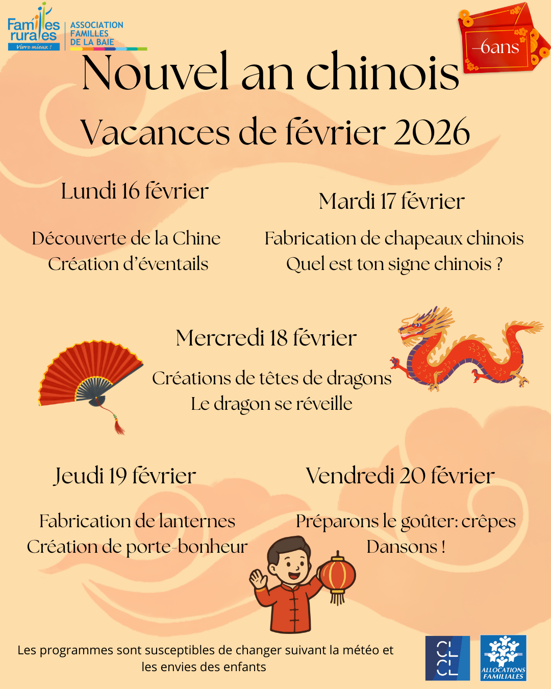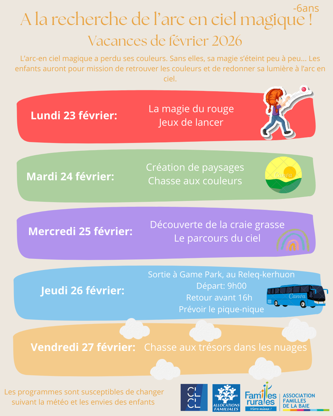 Programme des vacances de février chez les moins de 6 ans Publié par l'association FAMILLES DE LA BAIE le 30 janvier 2026 Partager Actualités Morbihan : atelier création en mosaïque adultes / jeunes le 29 janvier à Rohan Lire + Partager Bretagne : séjours été pour enfants et jeunes de l'association de Rohan. les inscriptions sont ouvertes ! Lire + Partager