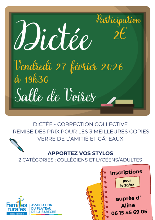 Dictée Publié par l'association FR Durnes le 6 février 2026 Partager En savoir plus dicte´e.pdf 367.00 KB dicte´e_1.pdf 367.00 KB Actualités Dictée Lire + Partager Activités éducatives avec les enfants Lire + Partager VIDE DRESSING Lire + Partager