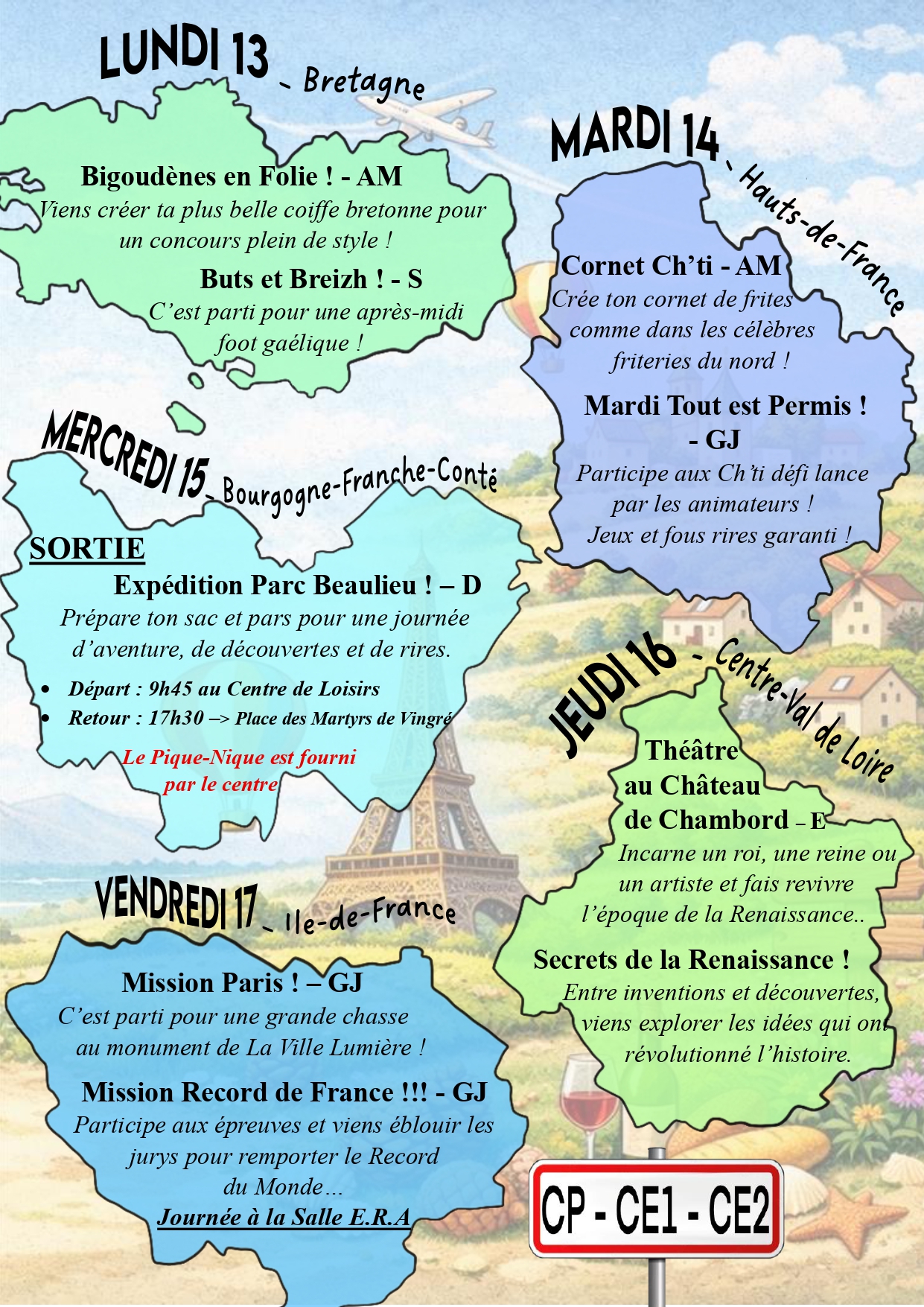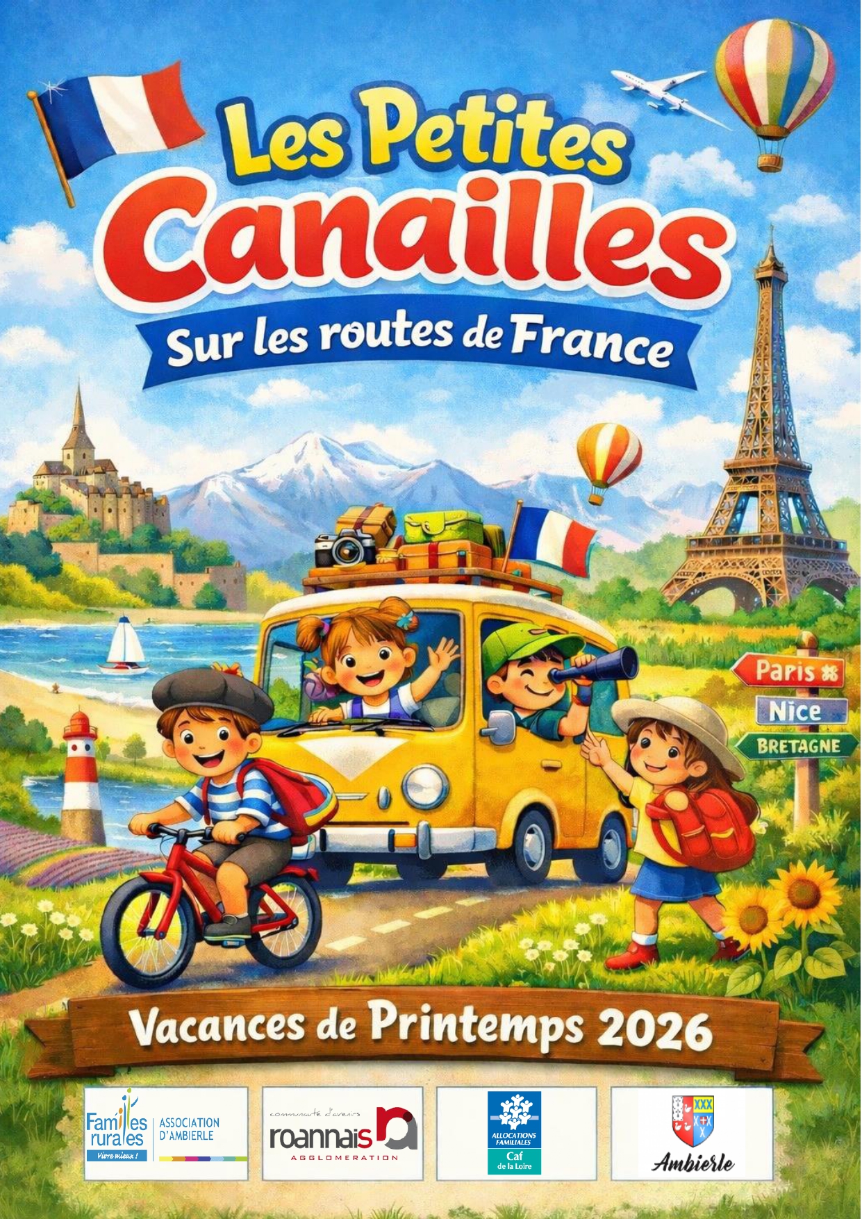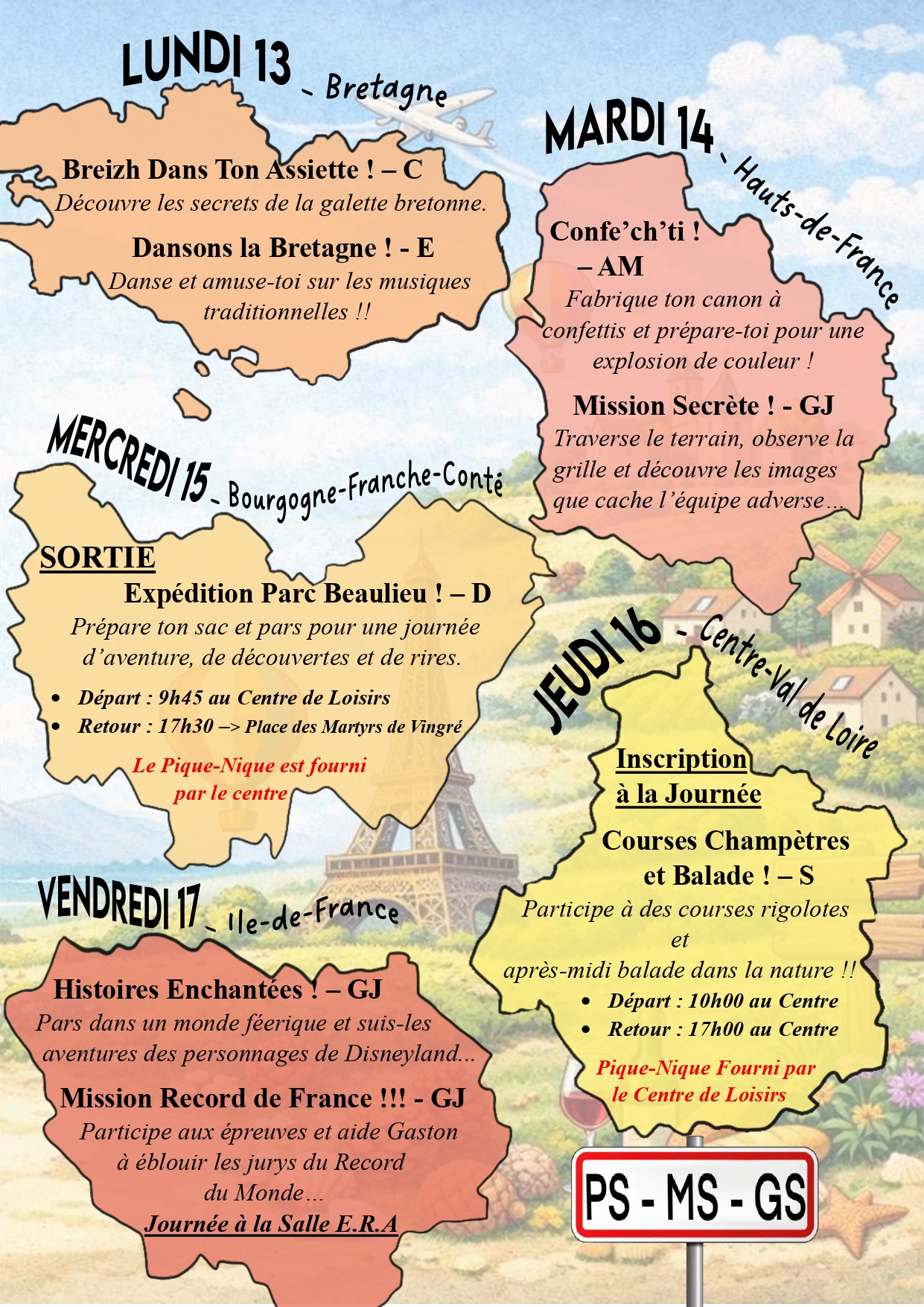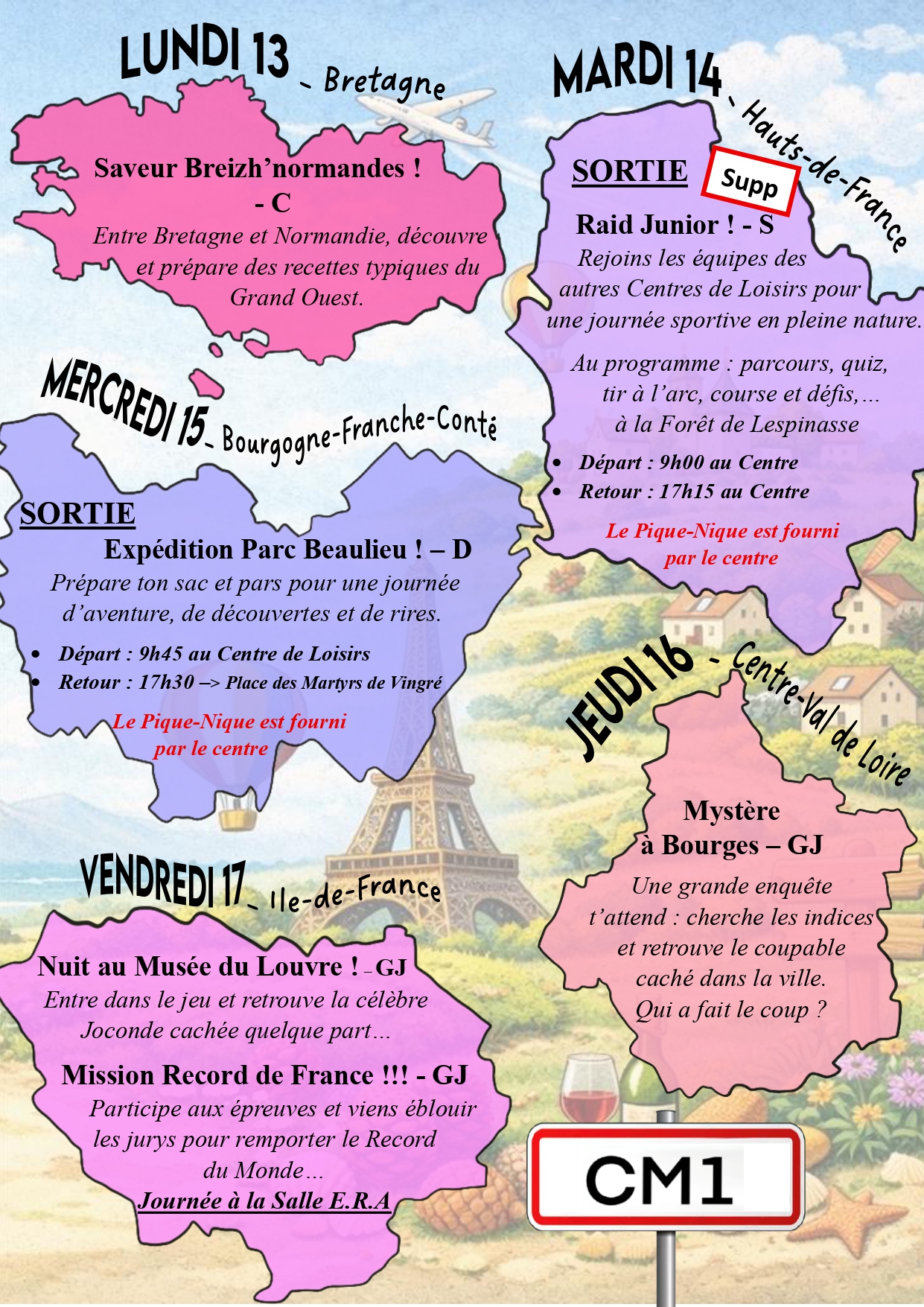 Prépare ton sac à dos on part en vadrouille !!! Le centre de loisirs de petites canailles vous emmènes faire un tour de la France et de ses régions !! Au programmes : découvertes des régions, des traditions culinaires, sportives et autres ... ⚠️Pour que votre inscription soit validée il faut que votre dossier soit à jour et que les vacances précédentes et les mercredis soient réglés ⚠️ Ouverture des inscriptions ce lundi 23 mars à partir de 19h sur afr-ambierle.millibase.net
