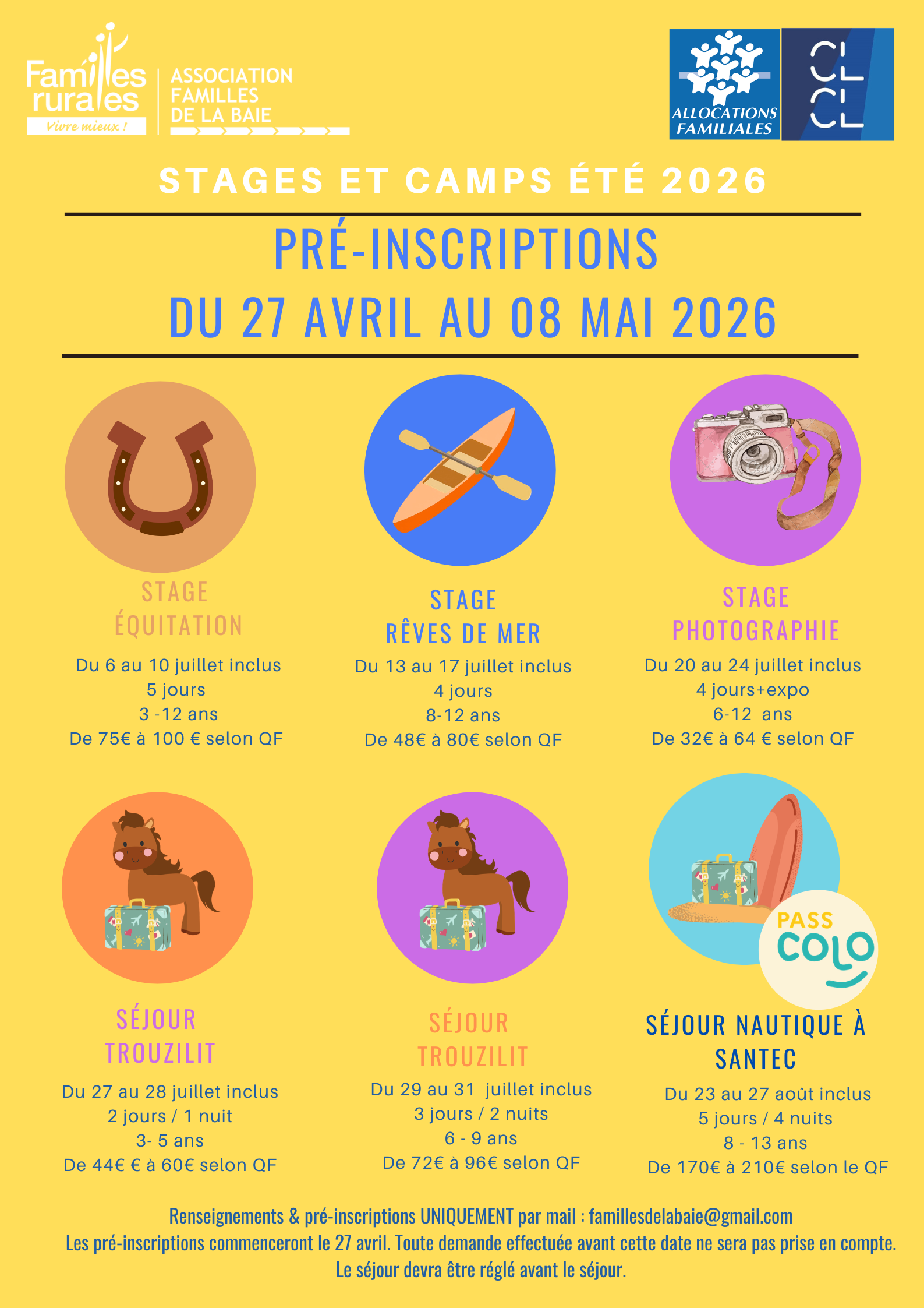 Plaquette camps et stages été 2026 Publié par l'association FAMILLES DE LA BAIE le 9 avril 2026 Partager Actualités Morbihan : atelier création en mosaïque adultes / jeunes le 29 janvier à Rohan Lire + Partager Bretagne : séjours été pour enfants et jeunes de l'association de Rohan. les inscriptions sont ouvertes ! Lire + Partager
