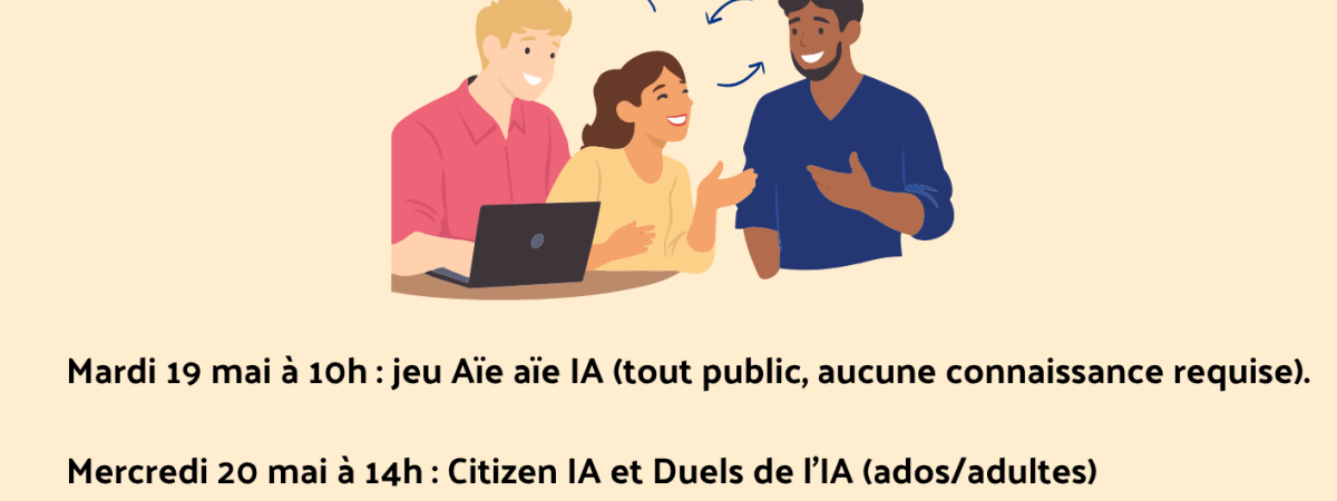 Dans le cadre de la **Semaine de l’IA pour Tous** ! Le mardi 19 mai à 10h, rendez-vous pour l'événement Aïe aïe IA, ouvert à tous sans connaissance Le mercredi 20 mai à 14h : Citizen IA et Duels de l'IA (public ados/adultes) Le samedi 23 mai à 10h30 : Duels de l'IA et jeu Aïe Aïe IA. Ouvert à tous sans connaissance Des séances auront également lieu auprès des scolaires. Objectif : permettre à chacun de mieux comprendre l’IA et de participer aux discussions sur son impact dans notre société. Inscription obligatoire au 02 33 57 16 81 ou epnmoyon@gmail.com