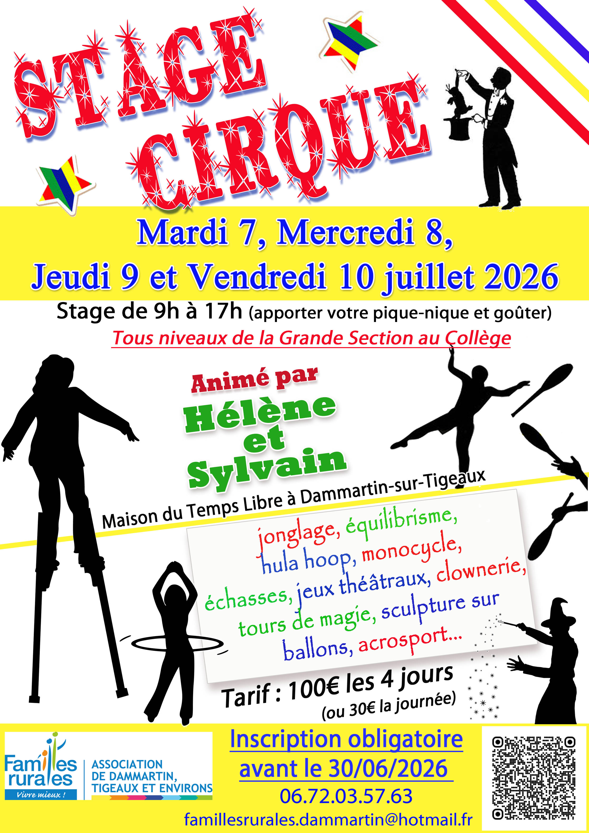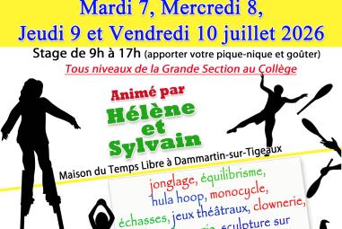 Nous vous proposons un stage de cirque pour les enfants les 7, 8, 9 et 10 juillet 2026 à Dammartin-Sur-Tigeaux.