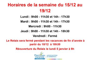 Horaire du Relais pour la semaine du 15 au 19 décembre